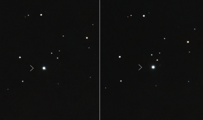 En seulement un jour d'écart, entre le 23 et le 24 août 2025, le déplacement apparent de Neptune parmi les étoiles est clairement perceptible. D'après Sky Safari le mouvement apparent de Neptune est actuellement de 81,7" d'arc par jour.