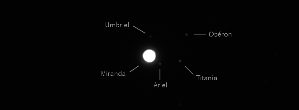 Le petit satellite Miranda, proche d'Uranus et faible en luminosité (16,2m), se révèle pour la première fois sur l'une de mes images planétaires, sous la forme d'une condensation dans l'anneau de diffusion. Les autres lunes d'Uranus sont plus faciles à distinguer, Titania (13,9m) et Obéron (14,1m) sont les plus distantes, Umbriel (14,9m) et Ariel (14,1m) sont un peu plus proches de la géante.