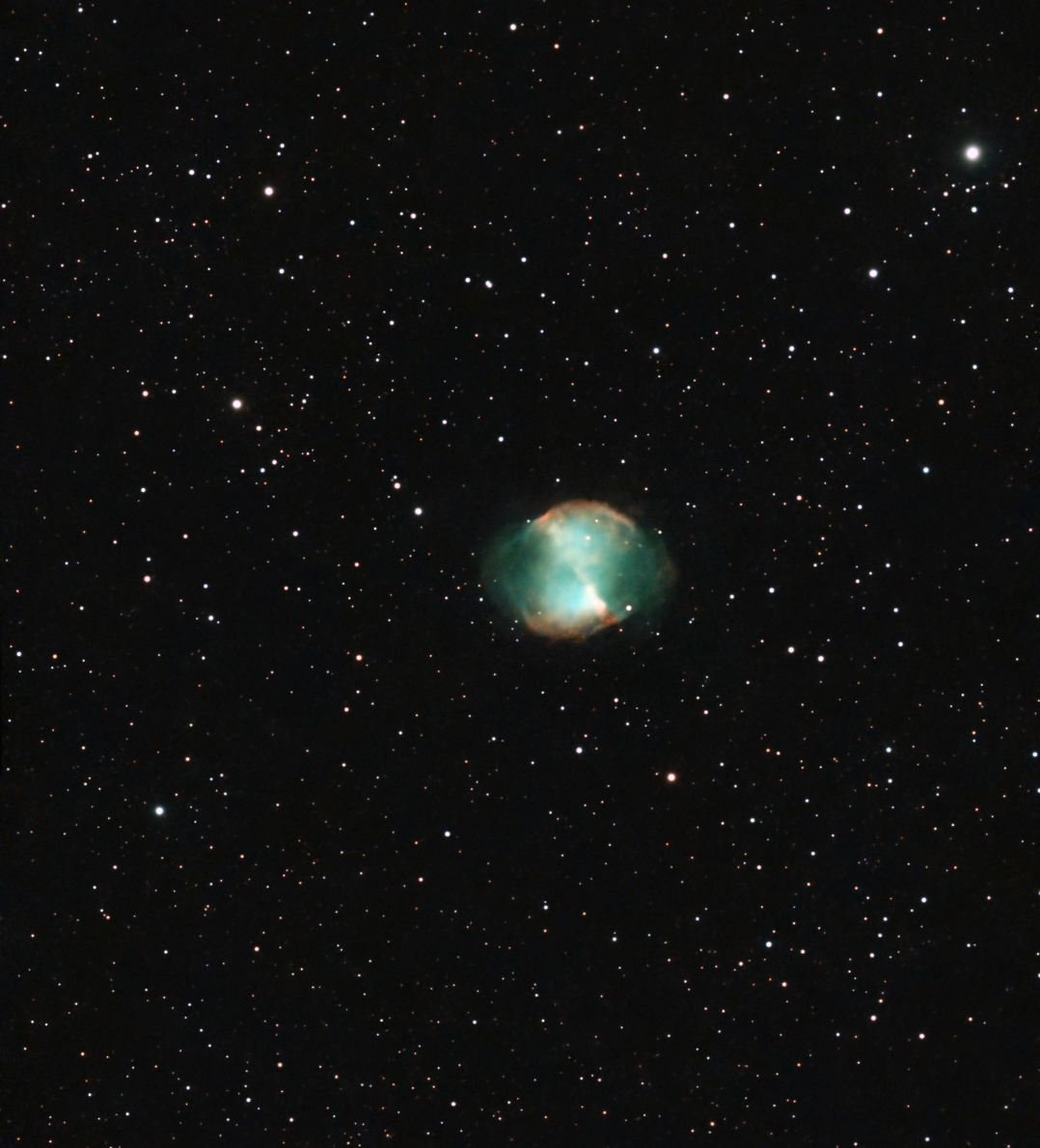 L'amas globulaire lumineux n'a pas nécessité beaucoup de temps de pose, du coup j'enchaîne rapidement avec une nouvelle cible. Je complète mon "book" des objets Messier avec la célèbre nébuleuse planétaire M27 (7,4m - 6,7') de la constellation du Petit Renard. Je l'avais déjà photographié avec le vespera 1 mais je ne lui avait pas encore tiré le portrait avec le Seestar, c'est désormais chose faîte. En très peu de temps de pose, cette nébuleuse planétaire située à 1250 années-lumière montre déjà de beaux détails. Je suis obligé de surveiller l'écran car la partie centrale de la bulle de gaz sature vite en luminosité alors que les extensions latérales plus faibles commencent à bien se dessiner. Le rémanent gazeux de M27 est assez étendu pour un objet de ce type, sa taille réelle est évaluée à 2,4 années-lumière, voir 5 années-lumière si l'on tient compte du faible halo périphérique. La nébuleuse se serait formées il y a 12 à 25 000 ans.