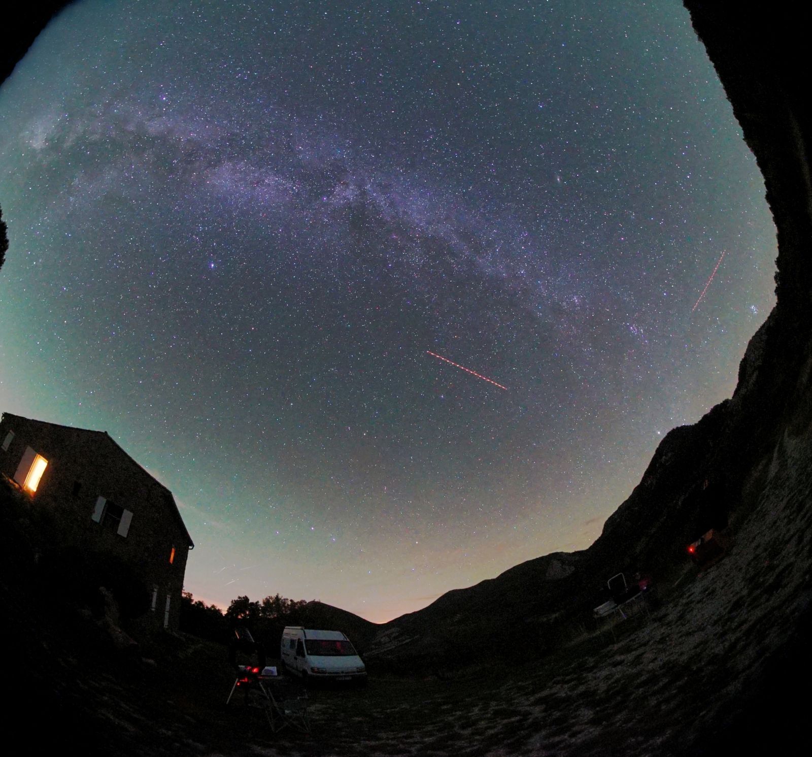 La nuit est là, la Voie Lactée étend son long ruban lumineux à travers le ciel. Bien que le ciel soit dégagé, il nous semble assez laiteux, la transparence n'est pas optimale ce soir. En photo, la voute étoilée apparaît assez verdâtre, cet airglow démontre que l'atmosphère terrestre est excitée par la forte activité solaire. ON sait maintenant pourquoi le ciel n'est pas très noir ...