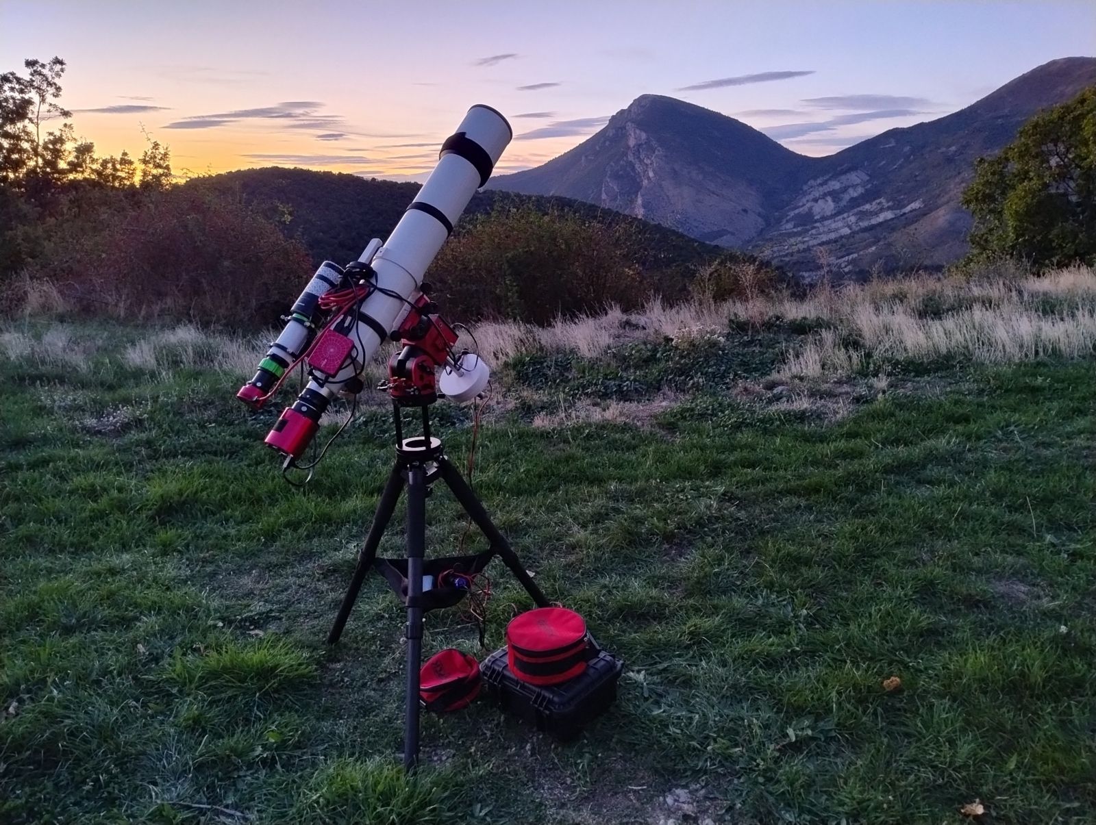Les instruments sont prêts, il n'y a plus qu'à attendre la nuit. Les voiles nuageux qui striait le ciel durant l'après-midi se dispersent petit à petit, dévoilant de large pans de ciel bleu. J'espère que nous aurons une belle nuit car à la dernière nouvelle Lune le ciel était souvent couvert, voir orageux et les observations du ciel profond ont été maigres.