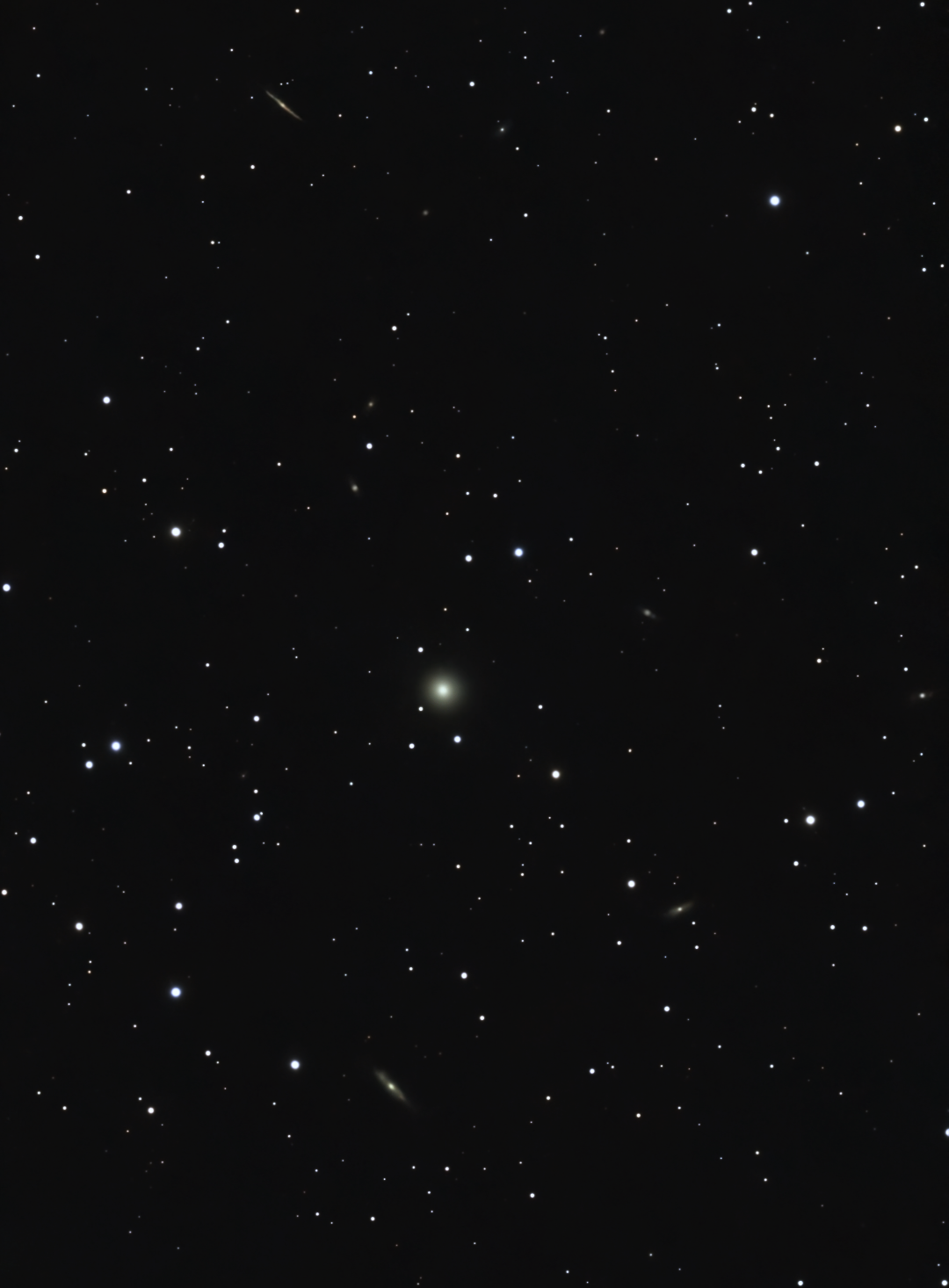 Comme hier, je décide de doubler l'observation visuelle avec une image au Seestar. Donc voici une photo de NGC 524, située à une distance de 101 millions d'années-lumière. Elle montre à l'oculaire du C9 l'aspect typique d'une elliptique de type E1, mais il s'agit en réalité d'une lenticulaire de type SA0^+(rs). NGC 524 est aussi une galaxie au noyau actif de type Seyfert 2, elle abriterait un trou noir supermassif de plus de 60 millions de masses solaires. Notons également la présence de deux belles galaxies vues par la tranche dans le champ photographié. Au nord se trouve NGC 522 (13,2m - 2,8'x0,5') et au sud NGC 532 (13,1m - 3,1'x1,0'). Ces deux là il faudra que je les dessine avec le Taurus 508 mm.