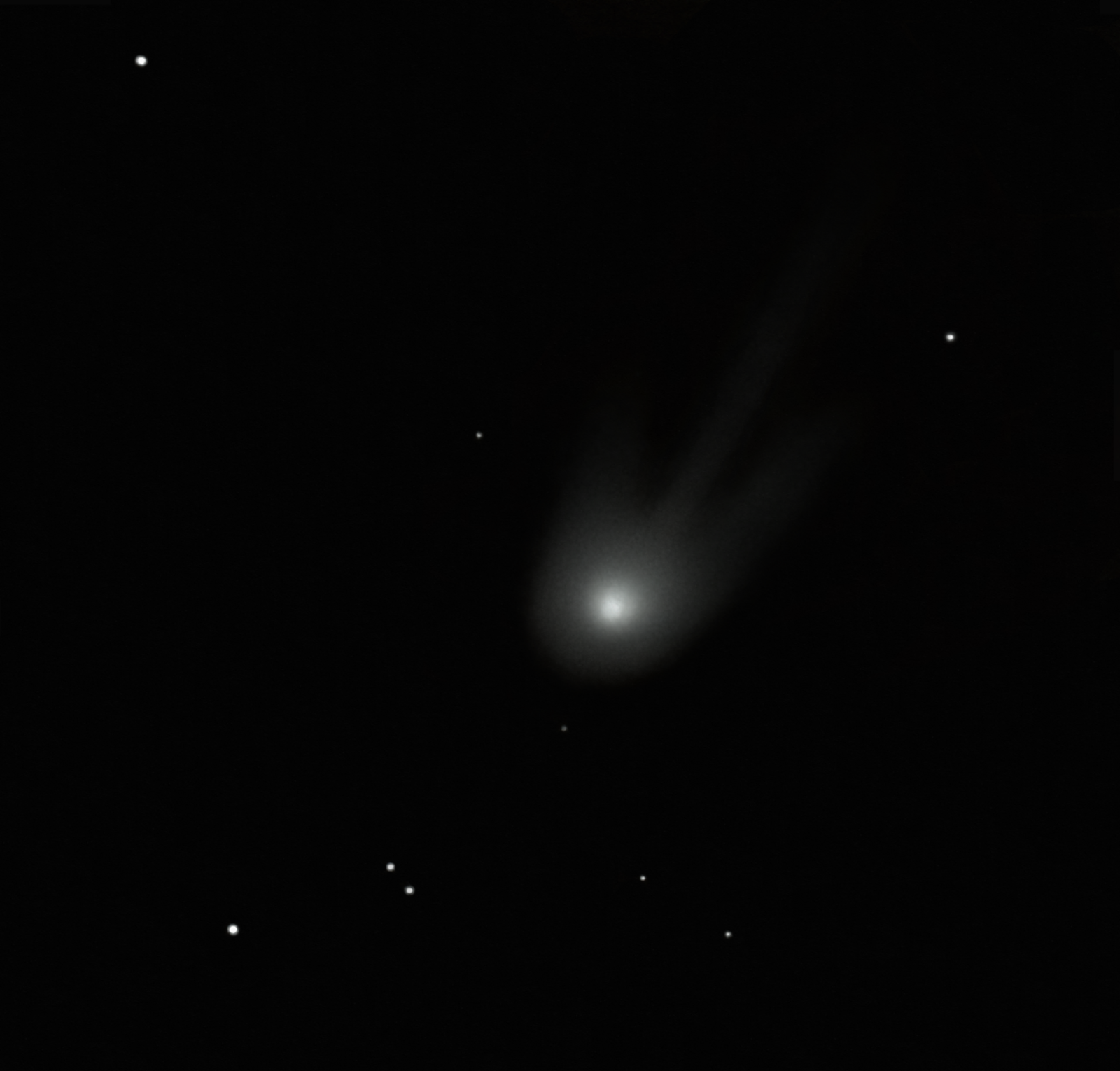 J'ai également effectué une observation visuelle et un dessin de la comète avec le Celestron 9 (235 mm). A 117x elle montre un noyau brillant et une grande coma elle aussi bien lumineuse. En vision décalée je parviens à distinguer le départ de la queue et deux extensions qui s’échappent des bords de la coma et entourent la queue.