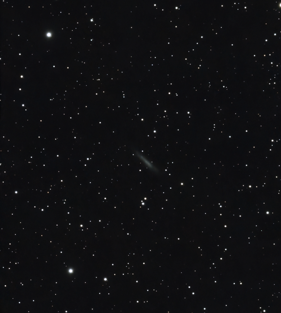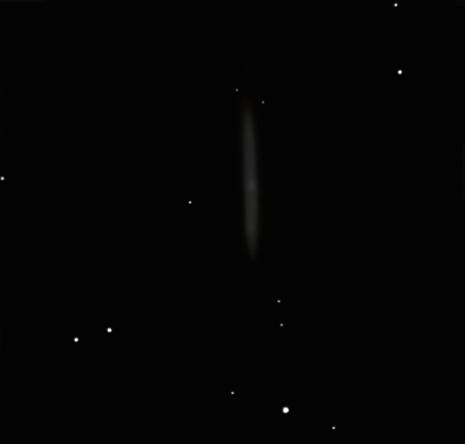 Je reste dans la constellation du Triangle pour rendre visite à la galaxie NGC 784 (11,5m - 6,6'x1,6'). Celle-ci se révèle large et pâle, elle ressemble à un long fuseau nébuleux peu contrasté et étiré dans le sens NE/SO. Son noyau est discret mais visible, quelques étoiles sont perçues (en apparence) aux abords de son disque galactique, mais à part çà la galaxie ne montre pas d'autres détails probant.